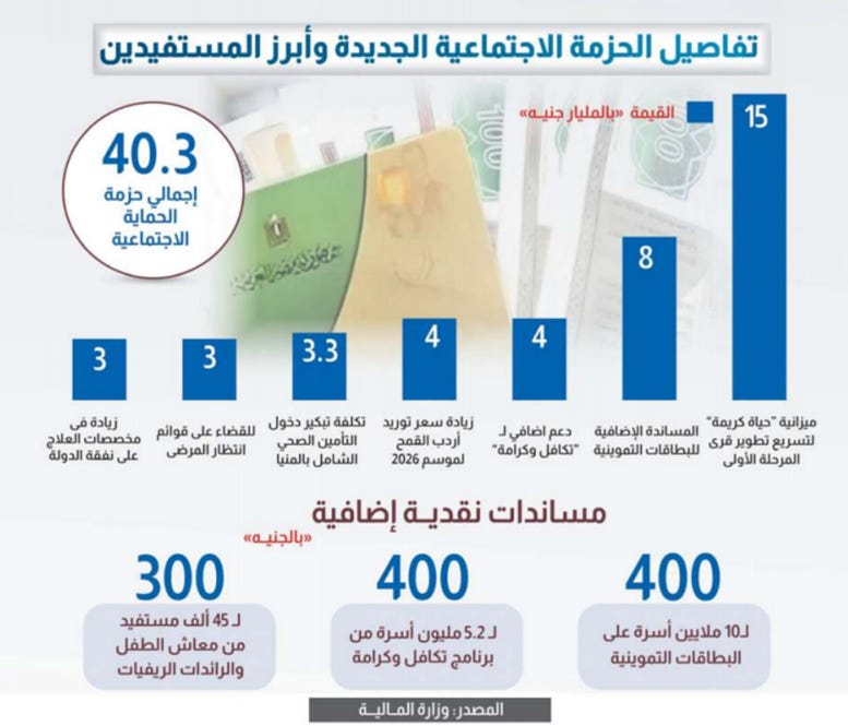 أكد، أحمد السيد، وكيل أول وزارة المالية، أن الحزمة الإجتماعية الجديدة تركز على دعم الفئات المستحقة والأسر الأكثر إحتياجا، في إطار توجه الدولة لتعزيز الحماية الإجتماعية. وأوضح، خلال مداخلة تلفزيونية، أن توجيهات، الرئيس عبد الفتاح السيسي، شملت تبكير صرف المرتبات قبل شهر رمضان وعيد الفطر، بما يساعد الأسر على تلبية إحتياجاتها الأساسية خلال هذه الفترة. وأشار إلى أن الحزمة، التي تبلغ قيمتها نحو 40 مليار جنيه، تستهدف دعم 10 ملايين أسرة من حاملي البطاقات التموينية من خلال صرف 400 جنيه لكل أسرة خلال شهري رمضان والعيد. وأضاف أن نحو 5.2 مليون أسرة مستفيدة من برنامج “تكافل وكرامة” ستحصل أيضا على دعم نقدي إضافي، إلى جانب تقديم 600 جنيه إضافية لـ45 ألف مستفيد من رائدات الريف والأطفال بلا معيل.