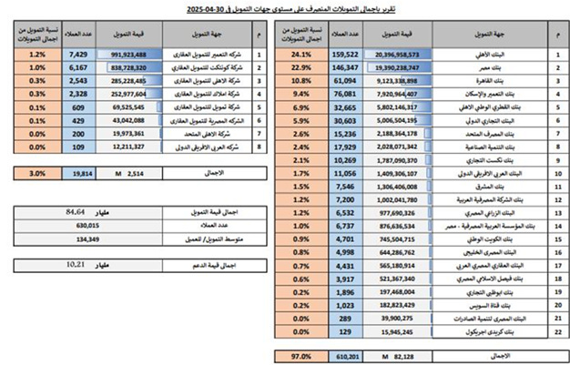 إرتفع إجمالي قيمة التمويلات العقارية الذي ضخته البنوك والشركات ضمن مبادرة التمويل العقاري لمحدودي الدخل إلى 84.64 مليار جنيه حتى نهاية أبريل 2025، لعدد 630.015 ألف عميل. ووفقا لتقرير صادر عن صندوق الإسكان الإجتماعي ودعم التمويل العقاري، فقد ضخت البنوك المصرية 82,128 مليار جنيه تمويلات ضمن المبادرة حتى نهاية أبريل 2025، مستحوذة على 97% من حجم التمويلات الممنوحة بعدد عملاء يصل إلى 610,201 ألف عميل. وجاء البنك الأهلي المصري في صدارة البنوك بقيمة 20.3 مليار جنيه، مستحوذا على 24.1% من حجم التمويلات. وإحتل بنك مصر المركز الثاني بقيمة 19.3 مليار جنيه مستحوذا على 22.9% من حجم التمويلات، ثم بنك القاهرة بقيمة 9.1 مليار جنيه مستحوذا على 10.8% من حجم التمويلات. على الجانب الآخر، ضخت شركات التمويل العقاري نحو 2.514 مليار جنيه تمويلات مستحوذة على 3% من حجم التمويلات الممنوحة، بعدد عملاء وصل إلى 19.814 ألف عميل. وتصدرت شركة التعمير للتمويل العقاري القائمة بنحو 991.9 مليون جنيه مستحوذة على 1.2% من حجم التمويلات، تلتها شركة كونتكت للتمويل العقاري بقيمة 838.7 مليون جنيه، مستحوذة على 1%من حجم التمويلات. وفي المركز الثالث جاءت شركة الأهلي للتمويل العقاري بقيمة 285.2 مليون جنيه، ثم شركة أملاك بقيمة 252.9 مليون جنيه.