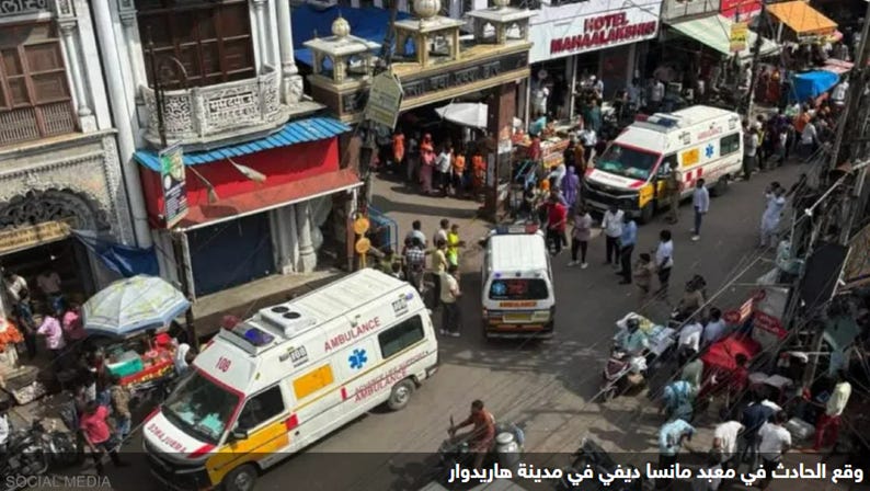 حدث تدافع في معبد مانسا ديفي الواقع على قمة تل في مدينة هاريدوار بالهند ، حيث تجمع المئات من الزوار، يوم أمس الأحد، مما أسفر عن مقتل ما لا يقل عن ستة أشخاص وإصابة 28 آخرين، وفقا لما أعلنته الشرطة. وقال برامندرا سينغ دوبال، كبير مفتشي الشرطة في هاريدوار، لوكالة برس تراست أوف إنديا، أن شائعات عن وجود تيار كهربائي في بداية السلالم المؤدية إلى المعبد تسببت في حالة من الذعر بين الحشود، مما أدى إلى التدافع. وأشار إلى أنه تم نقل 34 شخصا إلى المستشفى، وتوفي ستة منهم.