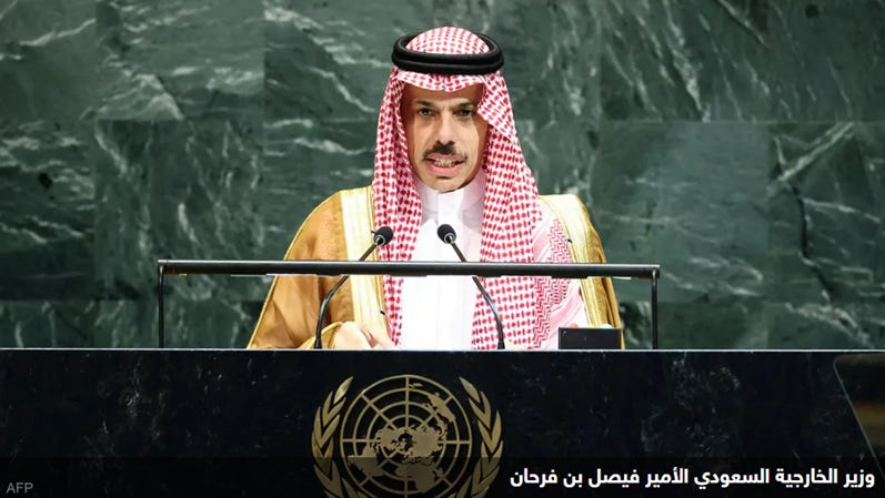 أكد وزير الخارجية السعودي، الأمير فيصل بن فرحان، يوم أمس السبت، أنه قد آن الأوان لإيجاد حل عادل للقضية الفلسطينية. وأضاف الأمير فيصل، في كلمته أمام الجمعية العامة للأمم المتحدة، أن “حل الدولتين هو الحل الوحيد، وعلى المجتمع الدولي تحمل مسؤولياته لإنهاء الصراع”، وذلك فيما يتعلق بالقضية الفلسطينية. وفيما يرتبط بالملف السوري، قال بن فرحان: “نشيد بجهود سوريا ونرحب برفع العقوبات عنها، ونطالب بوقف الاعتداءات الإسرائيلية عليها”. وفي الملف اللبناني، شدد على أهمية حصر السلاح بيد الدولة اللبنانية ودعم جهودها في هذا الملف، وضرورة إنسحاب إسرائيل من الأراضي اللبنانية. كما أكد على أهمية إستقرار الأوضاع في السودان، وحرية الملاحة في البحر الأحمر. ودعا وزير الخارجية السعودي إلى “منطقة خالية من أسلحة الدمار الشامل في الشرق الأوسط“.
