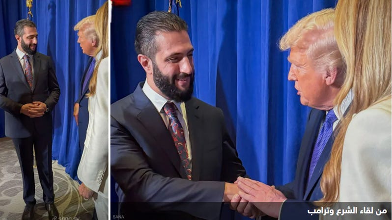 ذكرت وكالة الأنباء السورية الرسمية في ساعة مبكرة من صباح اليوم الخميس أن الرئيس السوري، أحمد الشرع، التقى الرئيس الأميركي، دونالد ترامب. وجاء اللقاء بين ترامب والشرع على هامش إجتماعات الجمعية العامة للأمم المتحدة في نيويورك. ونشرت الوكالة صورا للشرع وهو يصافح ترامب، بحضور السيدة الأولى، ميلانيا ترامب، دون أن تذكر المزيد من التفاصيل. ويعد هذا هو الإجتماع الثاني بين الشرع وترامب، بعد لقائهما في العاصمة السعودية الرياض في مايو الماضي.