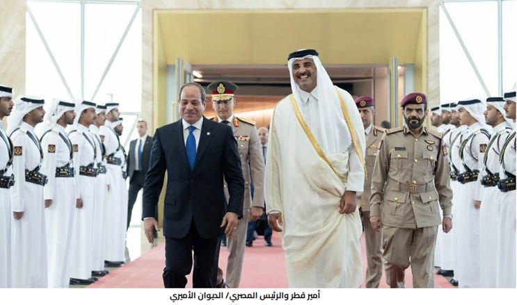 بدأ الرئيس المصري، عبد الفتاح السيسي، يوم أمس الأحد، زيارة إلى العاصمة القطرية، الدوحة، في مستهل جولة خليجية تشمل دولتي قطر والكويت. وكان في إستقبال الرئيس المصري في مطار حمد الدولي، أمير قطر، الشيخ تميم بن حمد آل ثاني. ويبحث الرئيس السيسي خلال زيارته لقطر مع الشيخ تميم بن حمد آل ثاني التطورات الإقليمية، خاصة ما يتعلق بالقضية الفلسطينية والجهود المبذولة لوقف إطلاق النار في قطاع غزة. كما سيعقد الرئيس السيسي لقاء مع ممثلي مجتمع الأعمال القطري لبحث فرص التعاون الإقتصادي. وأوضح المتحدث بإسم الرئاسة المصرية أن الرئيس السيسي سيتوجه بعد ذلك إلى الكويت، المحطة الثانية في جولته الخليجية، لإجراء مباحثات مع أمير دولة الكويت، الشيخ مشعل الأحمد الجابر الصباح، وولي عهده، الشيخ صباح خالد الحمد الصباح، حول مختلف الملفات الإقليمية ذات الإهتمام المشترك.